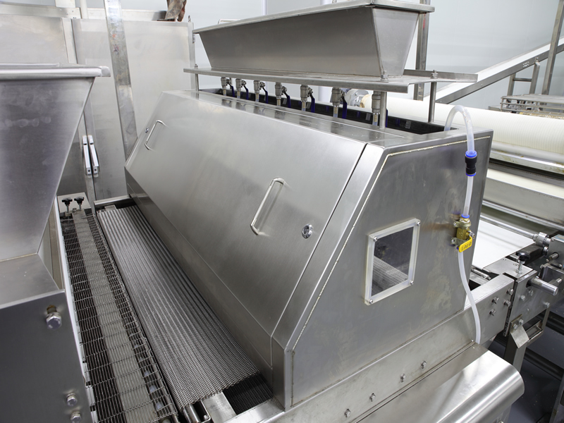 該設備應用于將固體顆粒或者粉狀調味料,鹽,糖,芝麻及果仁片等撒布在面皮或則餅干上。回收機回收多余的撒布物料循環利用。